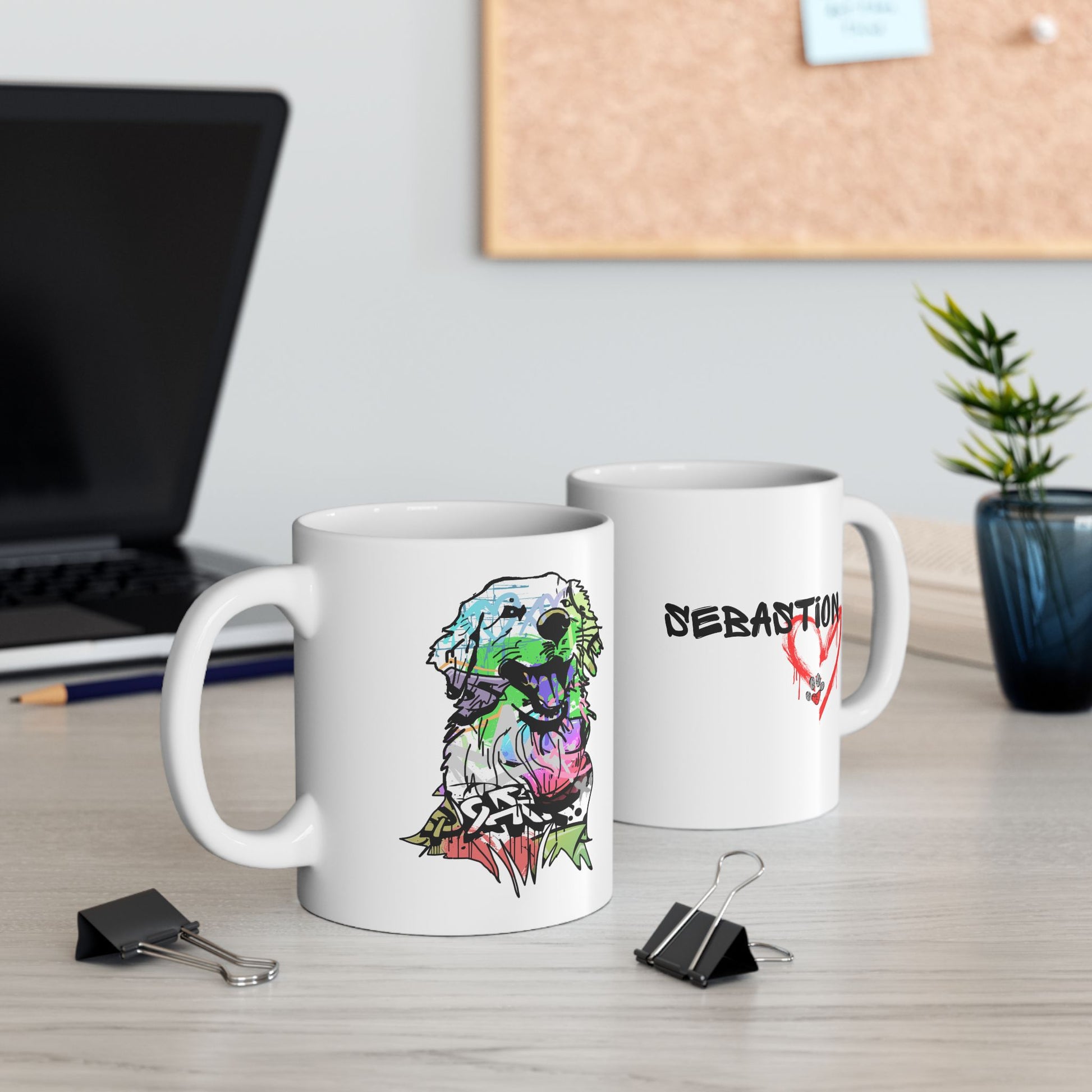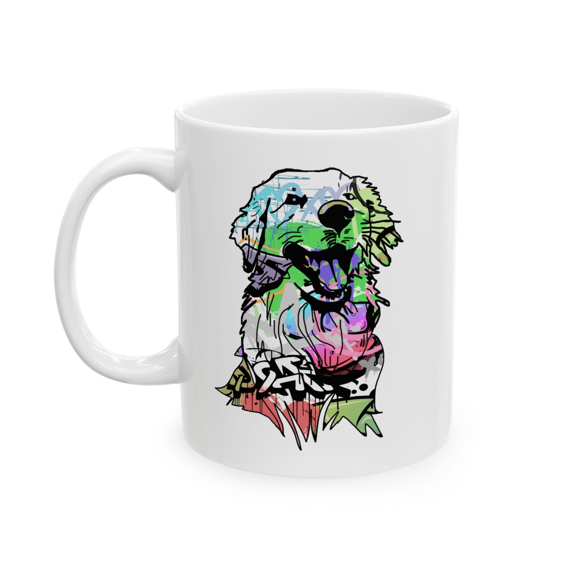 Graffiti street art inspired golden retriever digital illustration on a ceramic mug with personalized name. This mug adds a vibrant and artistic touch to your daily coffee or tea routine. Perfect for dog lovers and art enthusiasts. Ideal for gifting on birthdays, holidays, or special occasions.